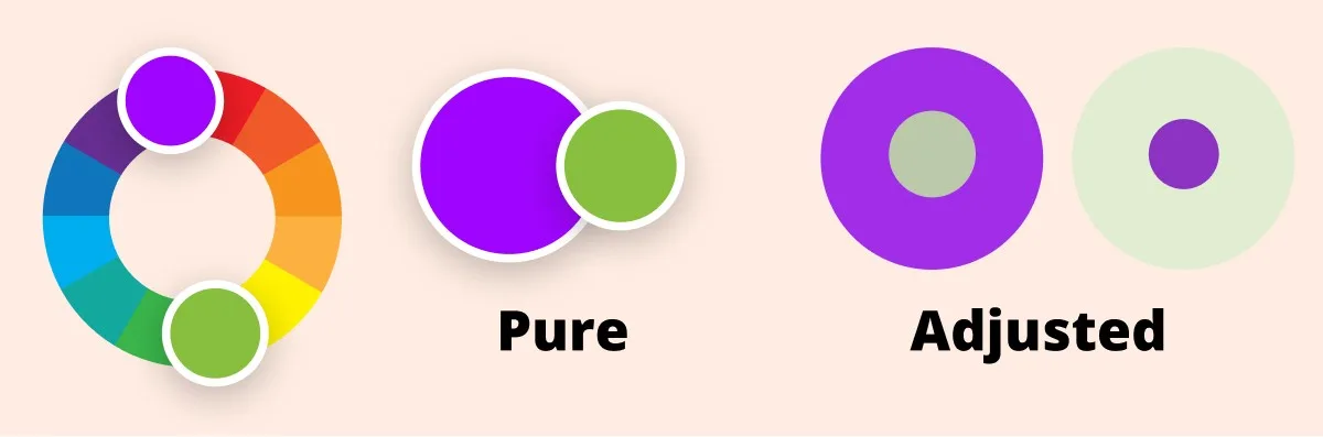 The colors in the color wheel are considered to be in their untouched, pure state. Meaning, they are fully 100% saturated, and high-contrast. Bright as hell, and hard to work within this state.