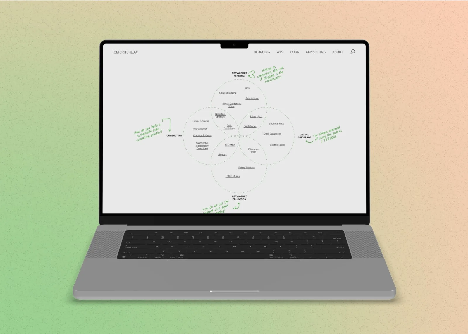 Before I go too far, I’d like to address another type of format: The visual Venn Diagram my friend Tom Critchlow likes to use. It’s less text-heavy, but it quickly indicates what his interests are, and what he loves to write about. It also acts as a Wiki so you can springboard into any piece of content he wants to feature. Check it out!